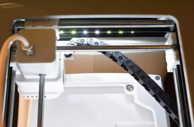 岩采用的是传统的十字结构,单轴双皮带传动打印起来稳定噪音小。机身内部还有两排 led 灯看起来非常漂亮。