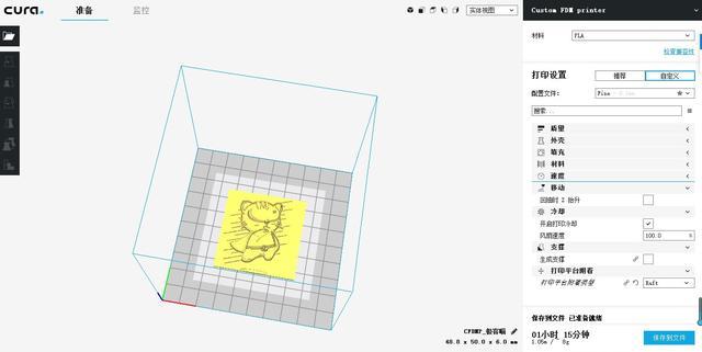 机器完全没问题,现在开始打印我自己做的模型咯,将画好的模型导入 CURA 有中文界面(关注孚领公众号,里面有下载地址和教程)用孚领的配置切好片将文件导入打印机就可以打印咯!