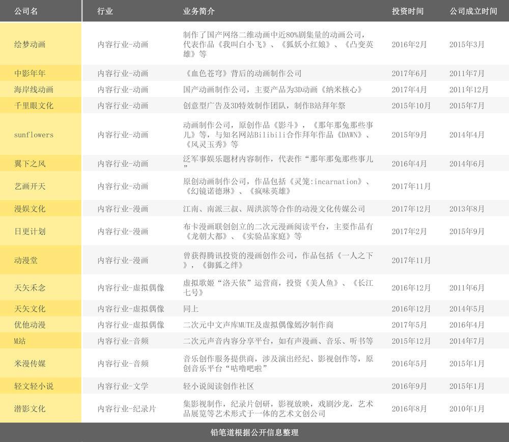 此外,B站已经通过投资入股,“买下”了ACG领域半壁江山。2015年9月投资动画制作公司sunflowers是B站首次战略入股外部公司。此后两年多的时间内,哔哩哔哩陆续投资了41家上下游企业,范围覆盖天使轮至中后期各个阶段。