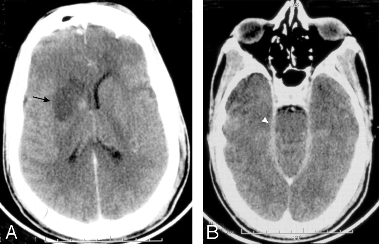 对比度增强的CT脑扫描显示右基底神经节梗塞(箭头,A)和增强的渗出物在脑内池(箭头,B)至于福氏耐格里阿米巴原虫为何会直接钻进大脑在科学界仍是未解之谜。