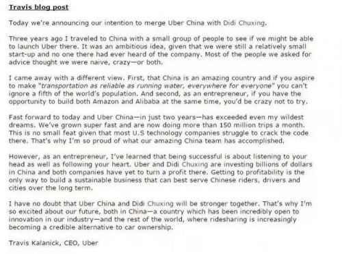 其实,今天早间,滴滴与优步中国合并的消息就开始在中外媒体之间发酵。首先,一张疑似Uber CEO特拉维斯·卡兰尼克(Travis Kalanick,以下简称TK)的博客文章在网上流传,TK在文章中指出,“优步中国和滴滴出行在中国都投入了数十亿美元,且两家公司尚未在该市场实现盈利。实现盈利是打造可持续业务的唯一出路,这能够更好的在长期服务于中国乘客、司机和城市,优步中国与滴滴出行的合并能够变得更加强大。”
