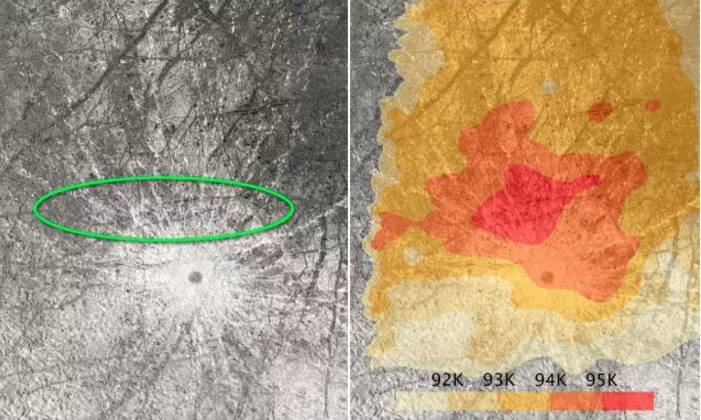 “土卫二上的羽状物与温度较高的区域间存在关联,因此哈勃望远镜在木卫二上拍到类似的羽状结构之后,我们也找出了伽利略号拍摄的热量图,看看这一地区情况如何。结果发现,木卫二羽状物所处区域也存在热量异常现象。”美国巴尔的摩太空望远镜科学研究所的威廉·斯巴克斯(William Sparks)指出。斯巴克斯在2014年和2016年都领导了针对羽状物的研究。