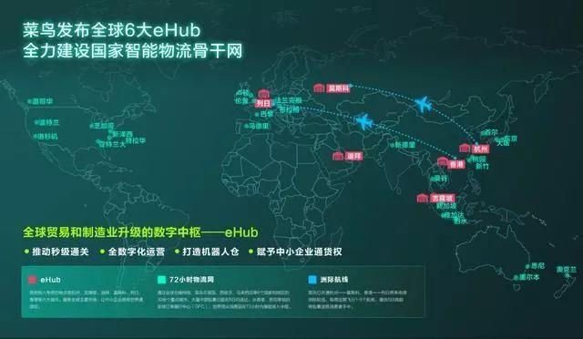 智能物流骨干网在全球打造物流枢纽,再基于技术,把生产制造商、销售商家、快递物流公司、第三方服务公司,以及产业链中的各个参与环节连接起来。目前菜鸟国家智能物流骨干网首批在全球布局了6大eHub节点,分别位于杭州、香港、吉隆坡、迪拜、莫斯科和列日。