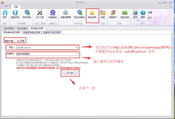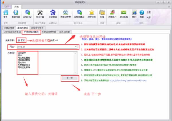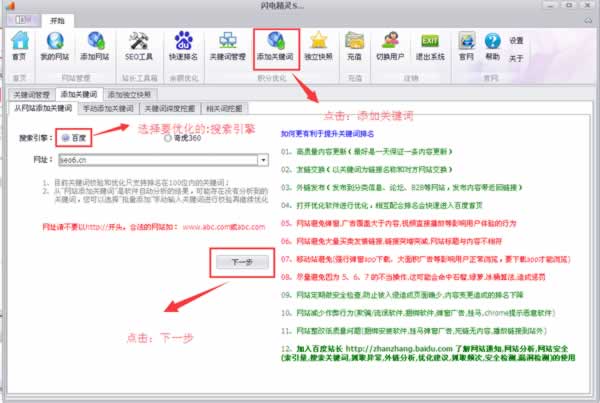三、 添加关键词—选择搜索引擎—选择优化网址—点击下一步