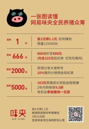 于是,继拍卖、正式发售之后,网易考拉海购再度联手网易味央上线全民众筹项目,让更多人参与养猪事业,同时享受相应的投资受益。