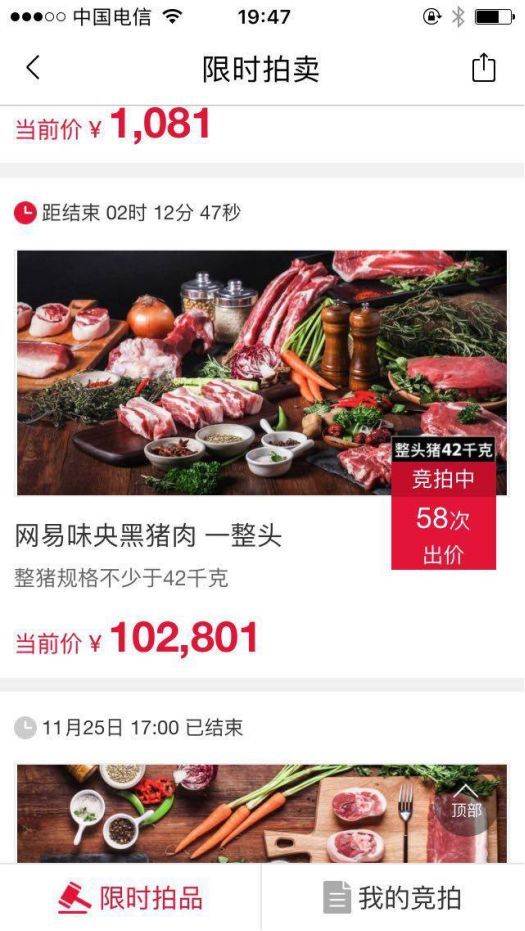 2016年11月25日,网易味央平台上首次进行黑猪拍卖,25日早上刚过10点,味央整猪仅1分钟竞拍价突破5000元。到22点,重量大概42kg的整猪出产的精品肉最终以109501元结束拍卖,竞拍次数64次。