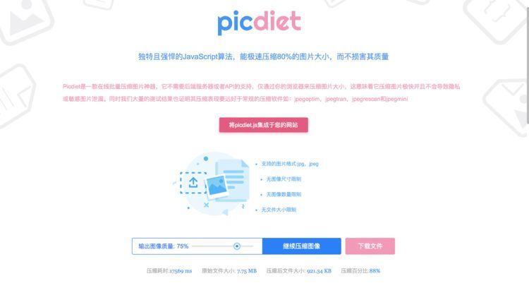 你可以使用这个在线工具来压缩图片,没有尺寸、大小、数量的限制,只需要上传原图,就可以重新选择图像的输出质量,下面会显示出原始文件的大小、压缩后文件的大小、压缩百分比等信息,你可以根据自己的需要来选择。这个工具胜在简单直接,不用进行复杂的参数设置,一步到位。当然它有一个缺点,就是只支持 JPG 格式的图片,如果你想压缩的是其他格式的图片,可以配合上面的格式转换工具使用。
