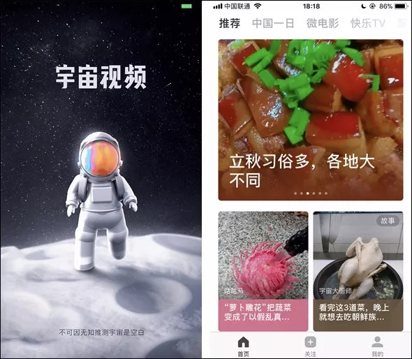 从名字和产品页面的风格来看,宇宙视频是定位为资讯类短视频应用,显然是奔着与快手截然不同的道路去的,因此有意将名字、风格和页面设计“高端化”,营造出一种全新的画风。