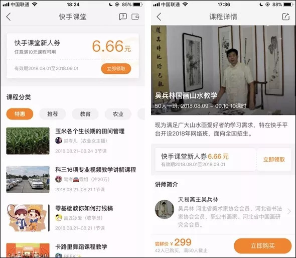 虽然还是内测功能,但场妹发现购买人数并不少。比如一门名为“吴兵林国画山水教学”的课程,售价为299元,写着满50人截止,目前已经有42人购买。