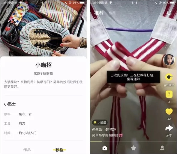 场妹了解到,如今抖音、快手上都有不少生活技巧内容,尤其是抖音上层出不穷的煮饭、摄影、穿搭等内容颇受用户喜爱,但也有不少网友吐槽“一动手就废”,表示短视频呈现的内容可操作性不强。