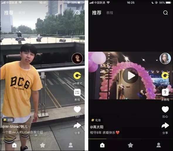 首先,“推荐”栏目下展现的是竖屏沉浸式的短视频,乍一看跟抖音极为相似,但是Uget的每一个视频都有一个“get模式”的按钮。