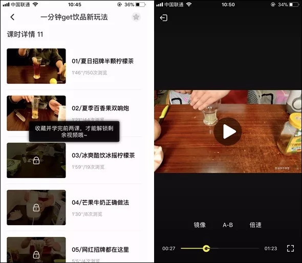 但第3个视频之后的视频都被锁定了,用户需要观看前两个视频并收藏该课程之后,才能完全解锁该系列的课程。