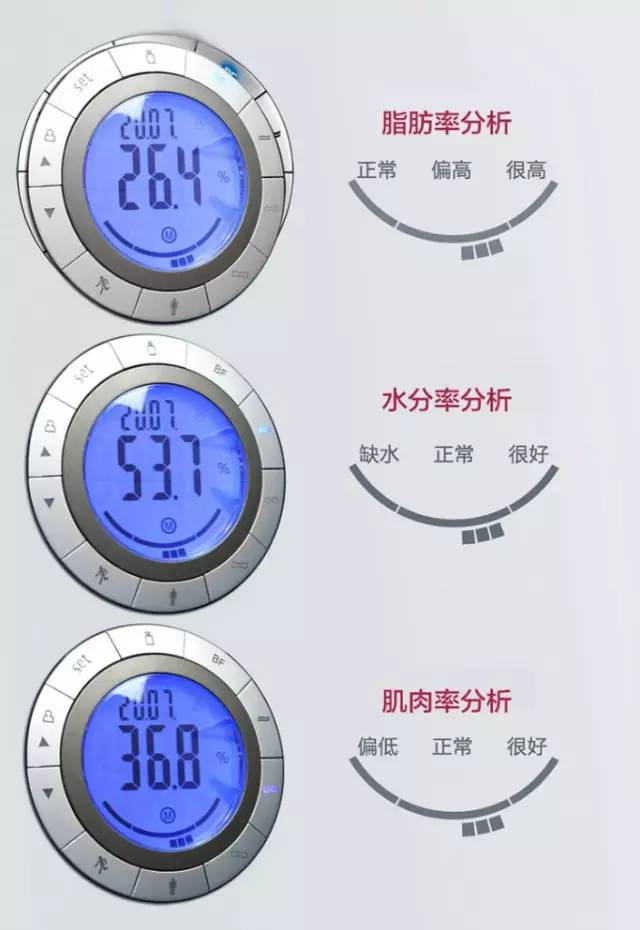 它能按顺时针方向,依次测量出你的体重、脂肪率、水分率、肌肉率、骨质量、基础代谢率以及活跃代谢率。