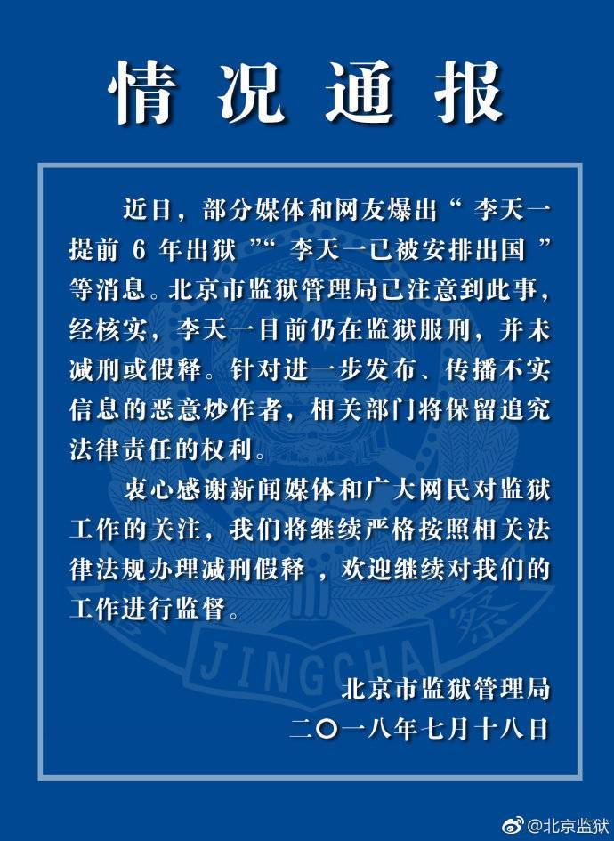 @北京监狱【李天一出狱?北京监狱辟谣:没有出狱】李天一,著名歌唱家李双江和梦鸽的儿子,2013年时以强奸罪判处有期徒刑十年。近期有网络传言称李天一将提前出狱,北京监狱管理局发布通告称李天一仍在监狱服刑,并未减刑或假释。