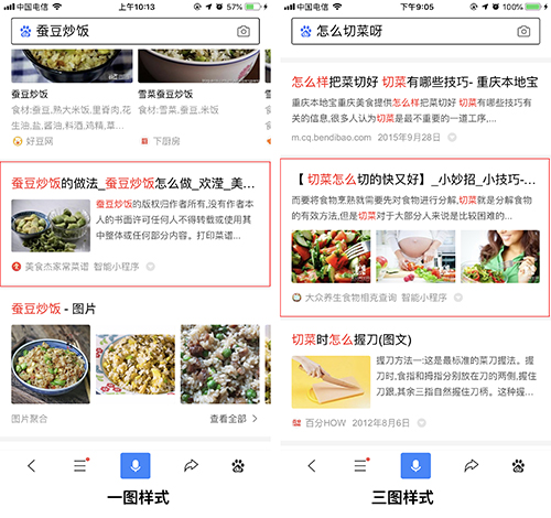搜索结果中展现图片,一方面可以让搜索用户有更好的浏览体验,同时也可以为搜索结果带来更多点击。现在面对智能小程序推出搜索结果出图权益,允许开发者推荐智能小程序在搜索结果中展示的图片。搜索结果出图的图片样式共分两种,一图样式和三图样式,现阶段一图样式已全量开放,三图样式内测逐渐开放中。