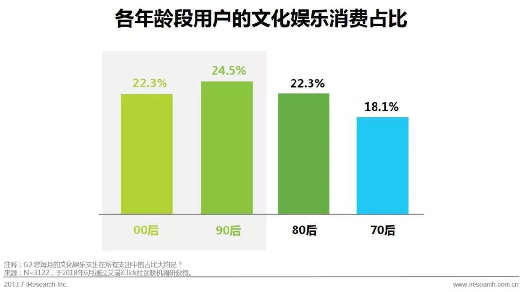 从艾瑞数据来看,00、90后新生代在文化娱乐消费的占比已超过24.5%,高于80、70后。这表明了00、90后群体文化娱乐消费已成熟,开始成为消费意愿最旺盛的群体。00、90后新生代个性鲜明、追求时尚,消费独立,热衷于各种形式的文化娱乐,在文化娱乐方面的支出占比较高,并成为娱乐产业的重要目标用户。