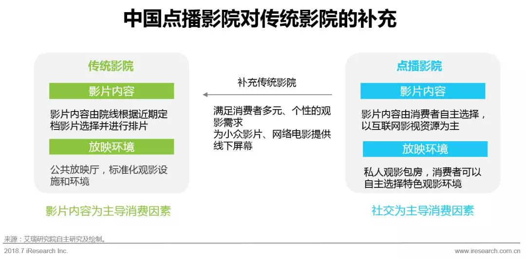 点播影院 是指通过互联网或电影技术系统,以点播、轮播、下载播放等方式,向个体或群体观众提供营利性电影放映服务的固定商业场所。从消费者角度看,相较于传统影院,点播影院可以满足多元、个性的观影需求并提供更加舒适私密的观影环境,成为新型社交场所。从电影产业看,点播影院作为传统影院的补充,为小众影片和网络大电影提供了线下屏幕,有望成为中国电影市场新的增长点。