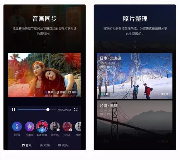 据了解,音兔目前有智能照片分组、智能匹配背景音乐、智能匹配转场特效三大核心功能。对相册进行分类、根据图片内容推荐音乐和让转场特效与歌词及节拍自动配合,正是这三个功能的体现。