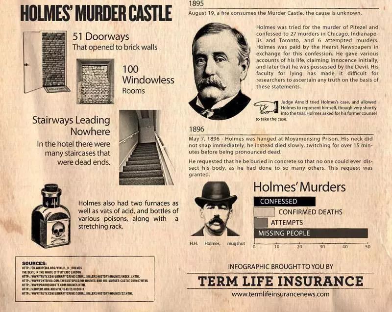 更令人毛骨悚然的是,类似的案件在近代也曾发生,甚至更为夸张。十九世纪末,被视为美国第一个连环杀手的H·H·霍尔姆斯(读多几遍就会发现,这个姓氏的另一种翻译是福尔摩斯,即Holmes),同样被认为是近代蓝胡子故事的灵感来源之一。