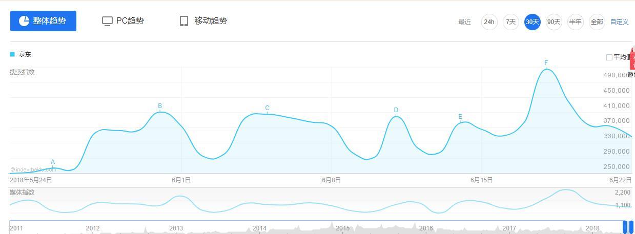 由百度搜索指数可知,这次京东618的活动预热引起了好几次波动,比如5.25集旺旺卡开始以后,5.26的618发布会,5.31的图书促销活动, 6.5的店铺粉丝节,等等,尤其是6.18达到巅峰。