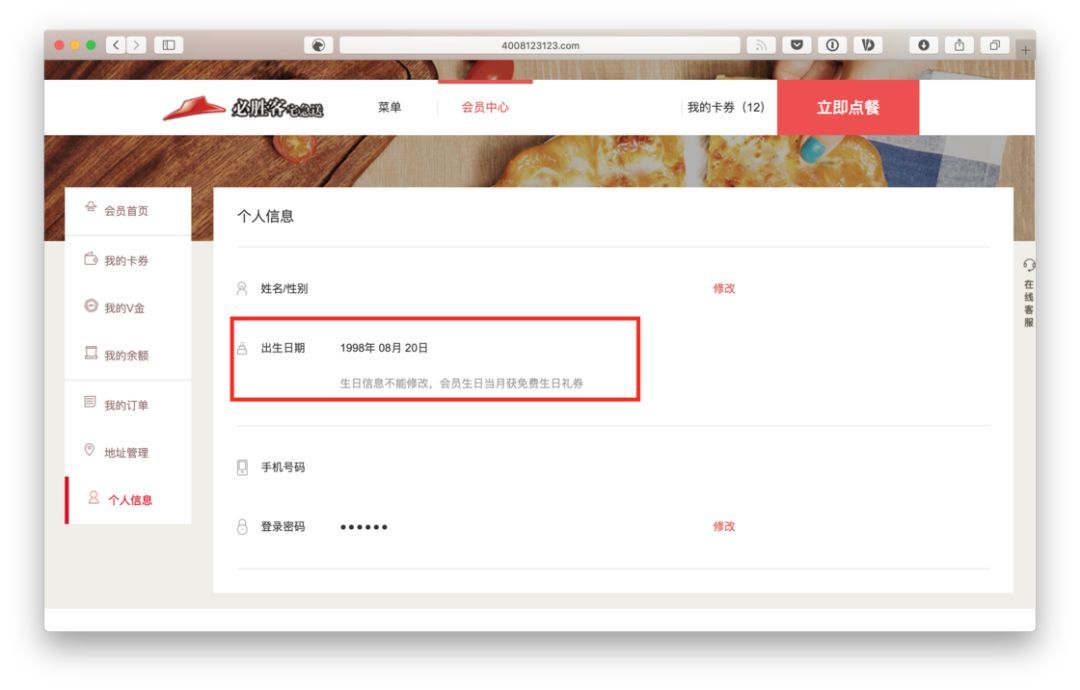 在必胜客宅急送 官网 完成注册后,你需要前往个人资料页面填入生日信息。等到生日当月时,个人账户中就会收到相应的外送券和堂食券。