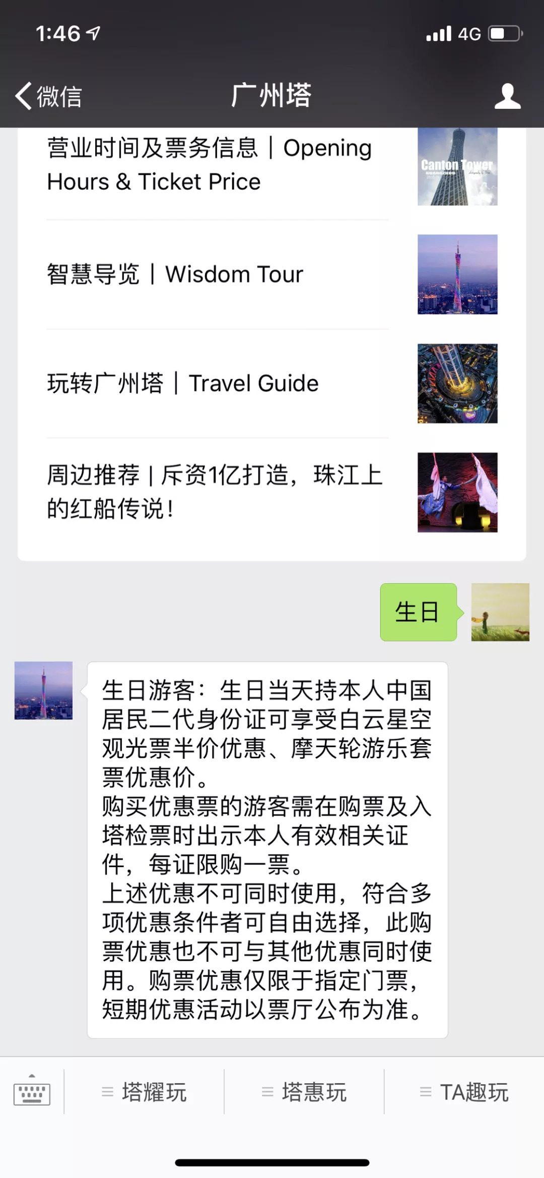 同样根据其官方公众号的介绍,生日当天凭借身份证,你可以享受观光票和摩天轮游乐套票的半价优惠。这项优惠无法与其他优惠活动同时使用。