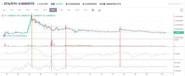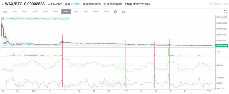 将这两个经典指标与价格走向叠加之后,可以基本判断出主力资金的进出情况(因为创新币只能与BTC或ETH交易,所以该币与ETH和BTC其中一个在图形上有相关波动,即可视作庄家用的是这一币种操盘)。这个指标组合存在滞后,但描述清楚过去一段时间里大额资金的流动足够了。