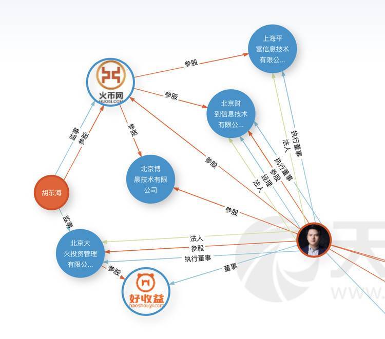 继续沿着此线索追溯,可以发现:杜均虽然已经从火币网离职,但其实藕断丝连。在火币网的国内企业主体之一“北京火币天下网络技术有限公司”中,杜均仍持有4.22%的股份,同时还担任着该公司的独立董事。而“北京火币天下网络技术有限公司”也参股了“北京财到信息技术有限公司”。