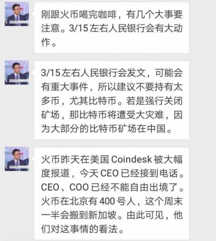一张在圈内流传的微信对话截图显示:央行将会在315期间“有动作”,并称火币CEO和COO已经被限制出境。甚至有人说,不排除采用叫停矿厂挖矿的严厉措施。