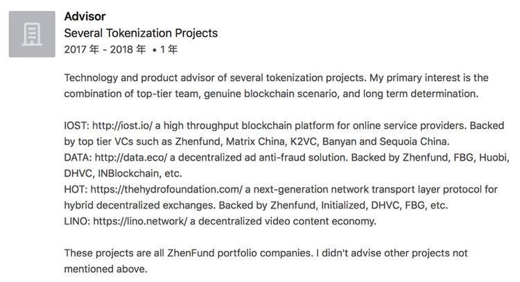 戴雨森,前聚美优品产品副总裁,于2017年7月离开聚美优品加入真格基金,担任合伙人职务。在戴雨森的LinkedIn页面上,最新的履历中清晰地写着自己目前担任IOST、DATA、LINO和HOT四个项目的顾问,这几个项目都是由真格基金投资的。这又是一处证明。
