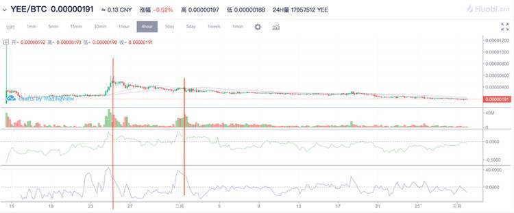 在DTA、IOST、WAX和YEE等几个币种中,都出现了以上一种或几种大额资金的操盘痕迹(以上盘面图中已用红色竖线标出)。其中有几个币种在刚刚上线交易时有明显拉盘现象。