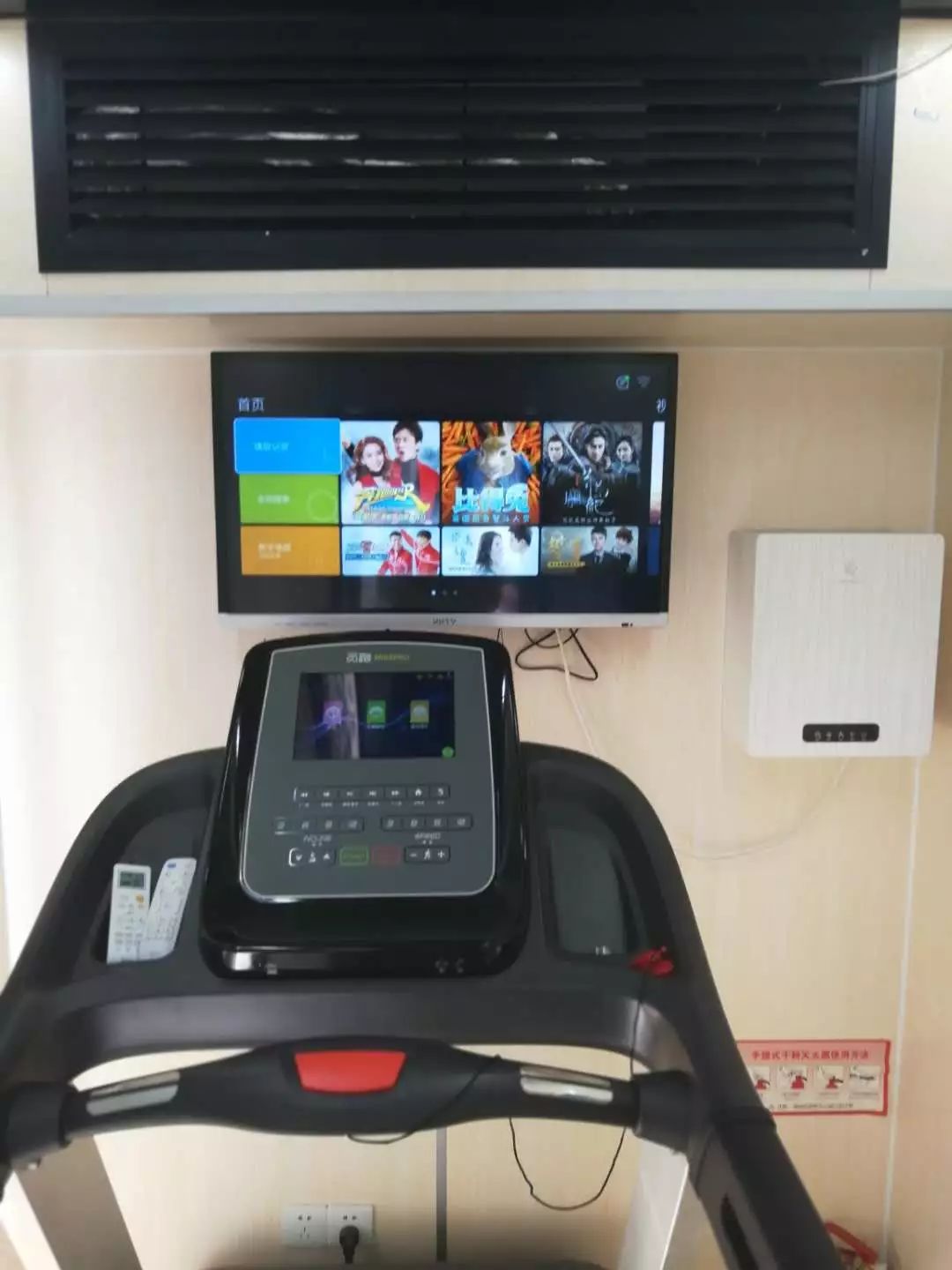 跑步机的上方有一台电视。跑步机的内置选项是娱乐、实景运动和健身模式,可以记录你的运动数据。其中娱乐子项目中又包含了爱奇艺视频、QQ音乐和今日头条,但是bug在于三款APP不可同时使用,就是说你没有办法在边听歌的时候边看新闻。