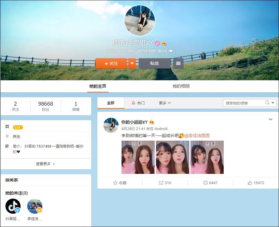 既然小甜甜跟她是好友,那么她是否借助了李佳洁背后的资源和团队进行了推广?不然为何小甜甜刚开了微博,她第一时间就放了她们的合照?