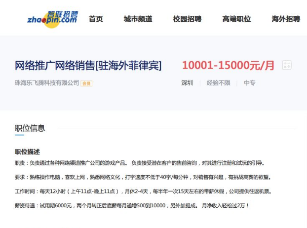 这些博彩公司与劳务中介合作,招聘披着海外推广、游戏客服等外衣,除了社交平台外,也遍布国内的正规招聘网站。