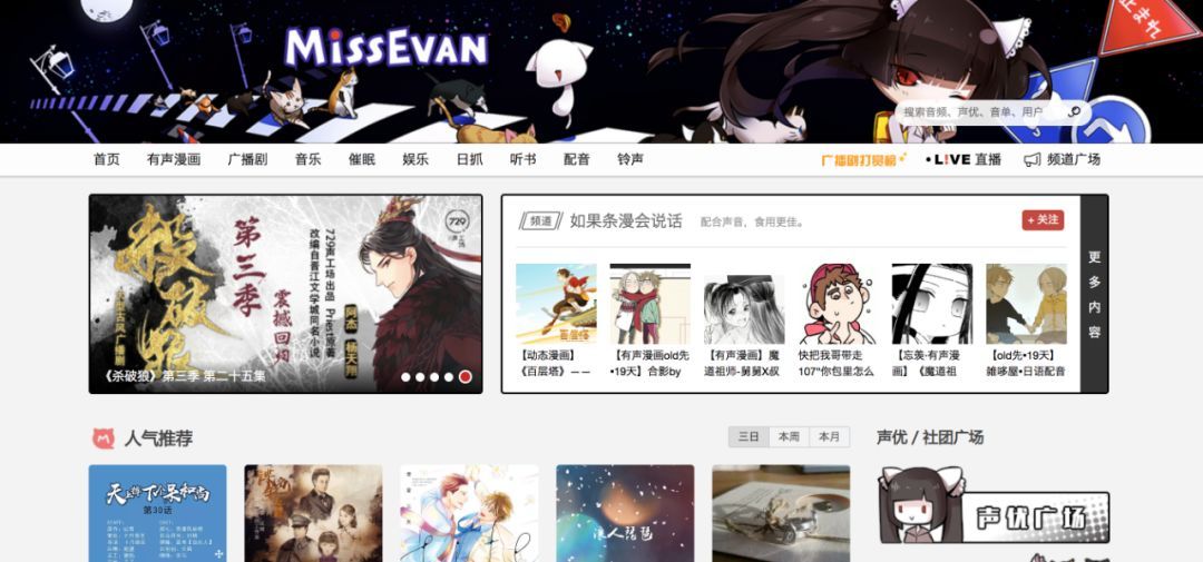 成立于2014年的M站,是国内早期的弹幕音图社区,同时也是国内声优基地。平台包含有声漫画、广播剧、电台等二次元及泛二次元的声音内容。据了解,M站已和腾讯动漫、网易漫画、有妖气、布卡漫画达成合作,将国内市场已成熟的头部IP制作成有声漫画,在M站长期播放。