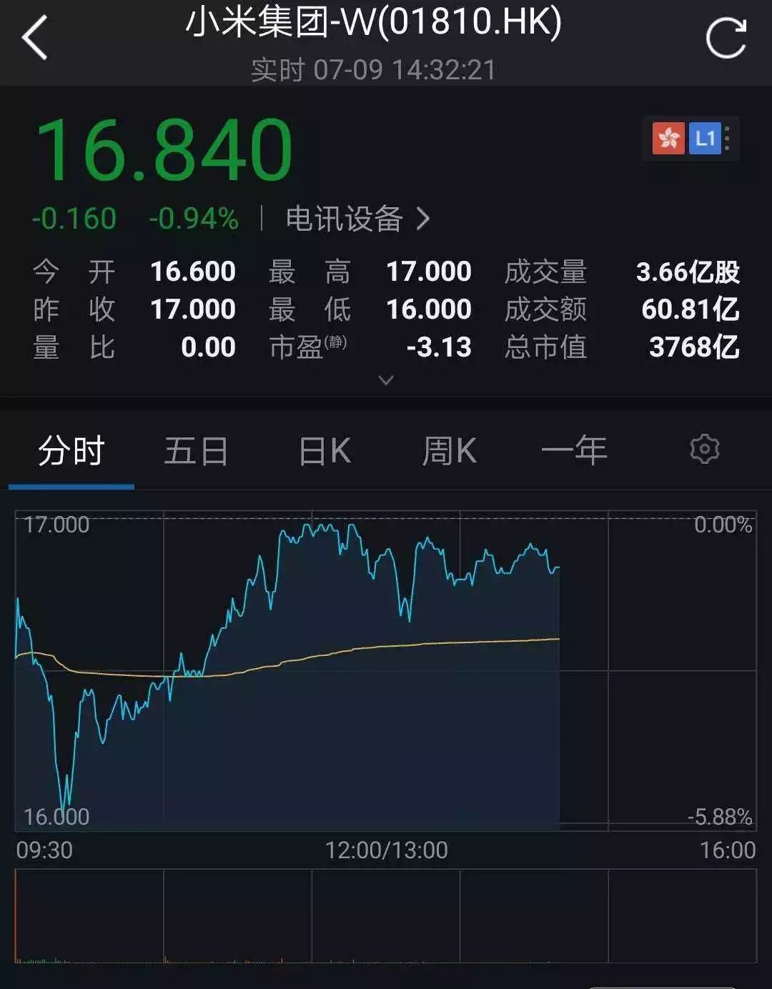 好消息是,小米股价在之后较开盘稍有回升,截至下午收盘,小米股价为16.8港元,较发行价下跌1.18%,市值3759.19亿港元,约合478.98亿美元。