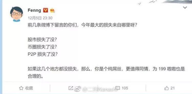 他不光暗示用户享受到共享单车红利的,不应该去退押金,还嘲讽为199元“嗷嗷”叫着退押金的用户,是纯屌丝。