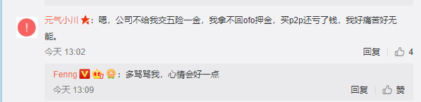 冯大辉看不惯用户对ofo的放弃,认为创业者会很辛酸。程苓峰也有此意,不过后者怼的是媒体,认为不该给ofo墙倒众人推的待遇,更何况ofo还没完全倒下。