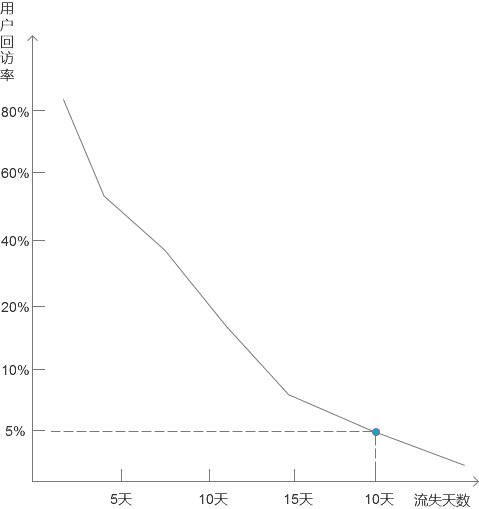对于用户流失时间,我们有一个一般定义:用户回访率在5%-10%区间,这个区间对应的时间点及之后的时间,我们认为用户已经流失。