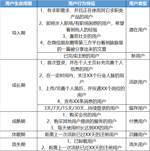 根据上图,用户的生命周期分为:导入期、成长期、成熟期、休眠期、流失期。