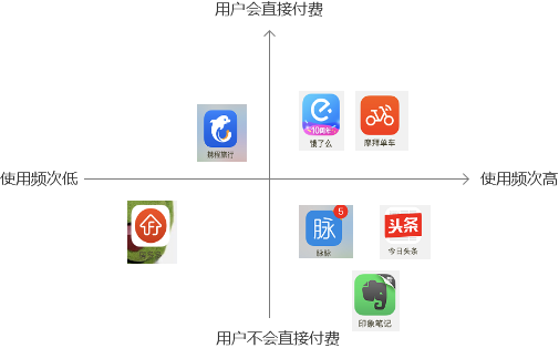 - 第三象限,用户不会直接付费,使用频次低。有人说,这个象限的产品没有价值和意义,有时候觉得,如果让我运营这样的产品,可能确实会很糟心。