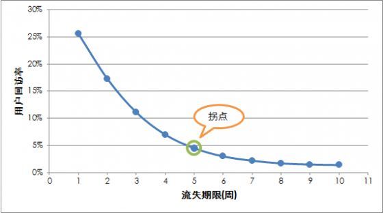 在拐点处,用户回访率为5%,这个拐点对应的流失期限是5周,在5周之后的用户回访率均低于5%。所以,我们认为,这款产品的用户流失时间,可以选择在用户停止发生XX行为5周后,该用户即为流失用户。