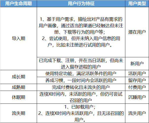 我们将用户生命周期、不同生命周期用户的行为表现,不同阶段运营所关注的重点工作进行阐释: