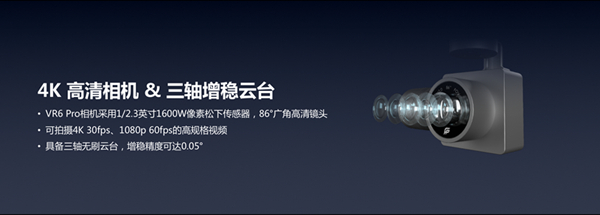 “飞的久,拍的6”,那么飞拍VR6 Pro到底拍的有多6?这也是飞友们最为关心的。据介绍,飞拍VR6 Pro配备了一枚1/2.3英寸,有着86° F/2.0大光圈、1600W像素的松下摄像头,最高支持4K分辨率拍摄,并配备三轴无刷云台。大光圈高像素高分辨率使得VR6 Pro拍出的画面品质更高,拥有更大的创作空间。而三轴云台则保证VR6 Pro可输出平稳顺畅的视频图像,让拍摄的每一帧画面都极具电影大片即视感。