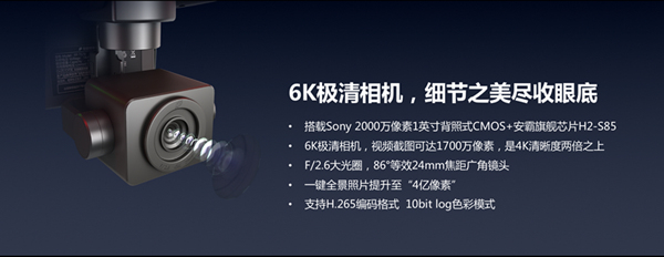 相机采用了1英寸大底2000万像素的索尼CMOS,F/2.6大光圈86°广角高清镜头,并且搭载安霸旗舰芯片H2-S85,支持录制6K极清视频,单帧像素可达1700万,清晰度是4K的2倍之上。