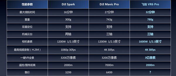 飞拍VR6 PRO 对比大疆Spark、Mavic参数