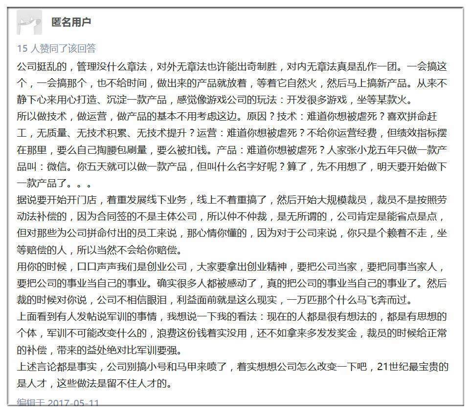 在知乎问题“车城网络科技有限公司这个公司怎么样,有发展前景嘛?”下方,自今年5月起,陆续有多个网友爆料车城网存在产品线混乱、内部管理缺少章法,以及裁员等问题。