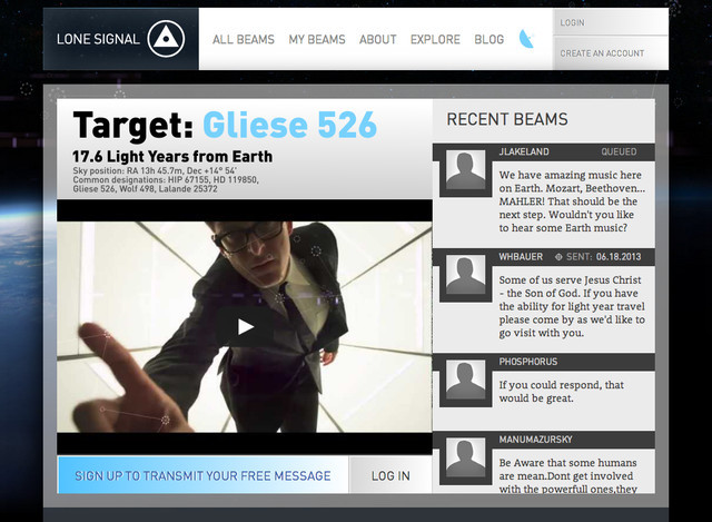 2013年,一个叫做“孤独信号”(“Lonely Signal”)的网站上线,这个组织租用了加州詹姆斯堡通讯卫星地面站,向17.6光年外的 Gliese 526星系发射了第一条无线电信号:“来自奇点大学(美国一所致力于培养未来科学家的学校)的问候。当你收到这条信息时,科技已足以让我们互相了解和交流。”并且,在网站上,他们接受任何人付费定制自己的信号,他们帮你发!