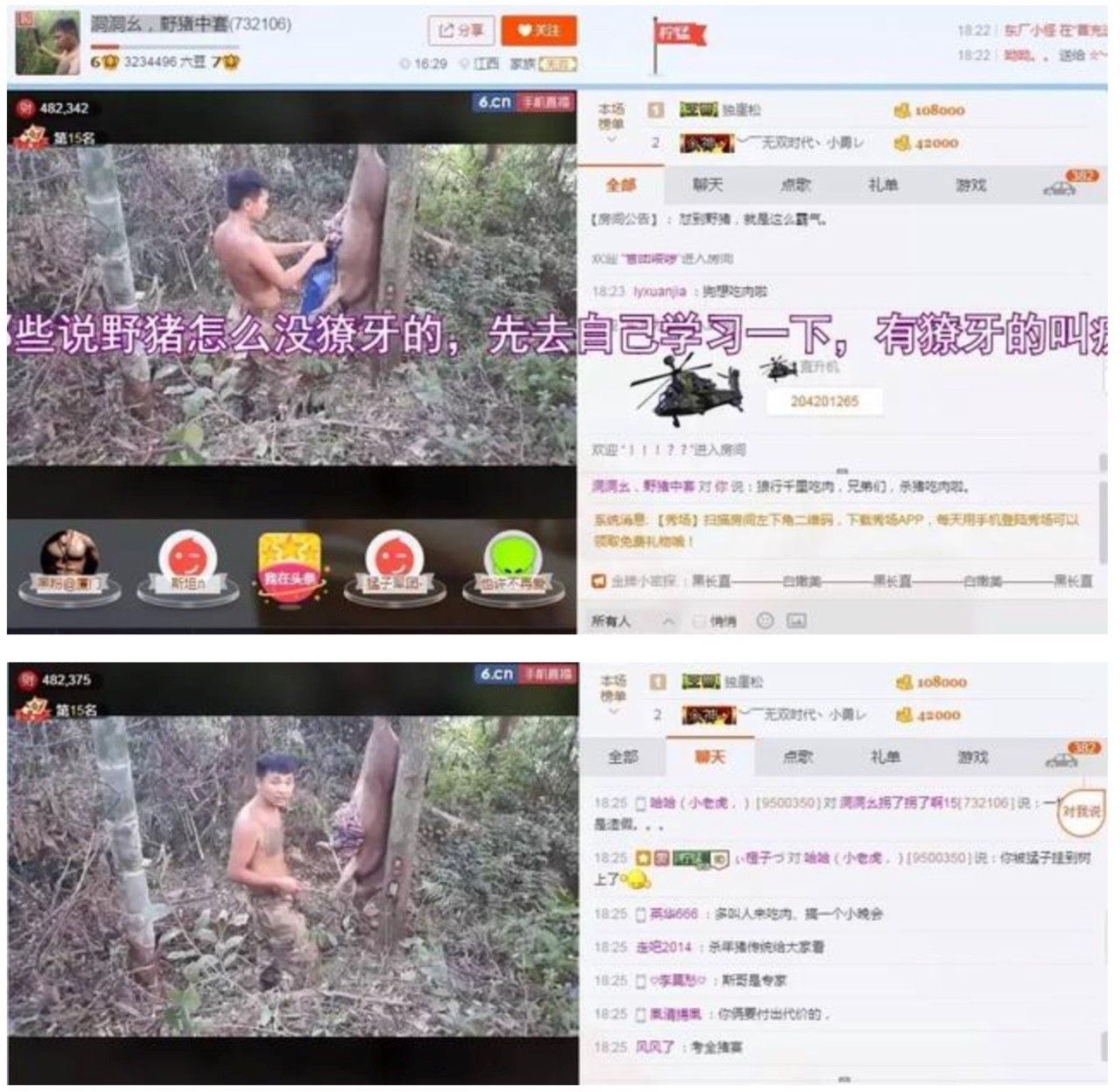 而且,六间房还在大力发展户外直播等差异化内容直播方向。户外主播“洞洞幺无奈啊”(房间号732106)(曾用名“猛子”)就在六间房直播中向大家展示自制陷阱捕到的一头野猪,并全程直播杀猪过程。“猛子”表示设了几天的陷阱,终于在昨天晚上捕到了猎物。这引起了网友们的争议,有人称野猪是保护动物,有人称把杀猪过程直播出来是否太血腥……但也有人乐此不疲,纷纷献上杀猪方案,一剑封喉、用水浇等等……整个直播过程让看惯了网红脸的用户们感觉新奇,有3万多真人同时在线观看。