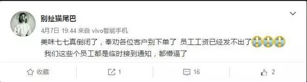 昨天下午开始,生鲜电商“美味七七”突然倒闭的消息已经在朋友圈和微博流传开来。